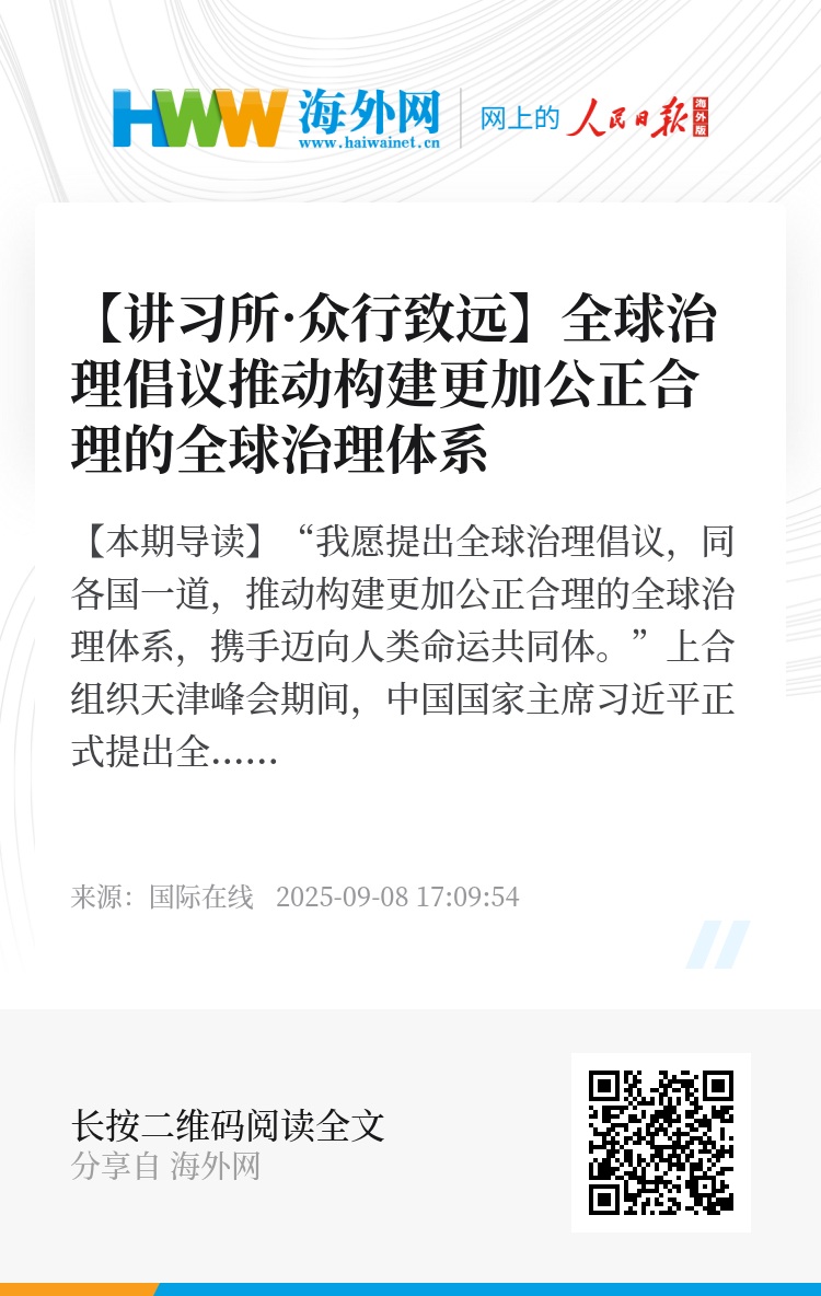 “我愿提出全球治理倡议,同各国一道,推动构建更加公正合理的全球治理体系,携手迈向人类命运共同体。”上合组织天津峰会期间,中国国家主席习近平正式提出全球治理倡议,深刻阐释这一倡议“奉行主权平等、遵守国际法治、践行多边主义、倡导以人为本、注重行动导向”的核心理念,是新时代中国为国际社会提供的又一重要公共产品。