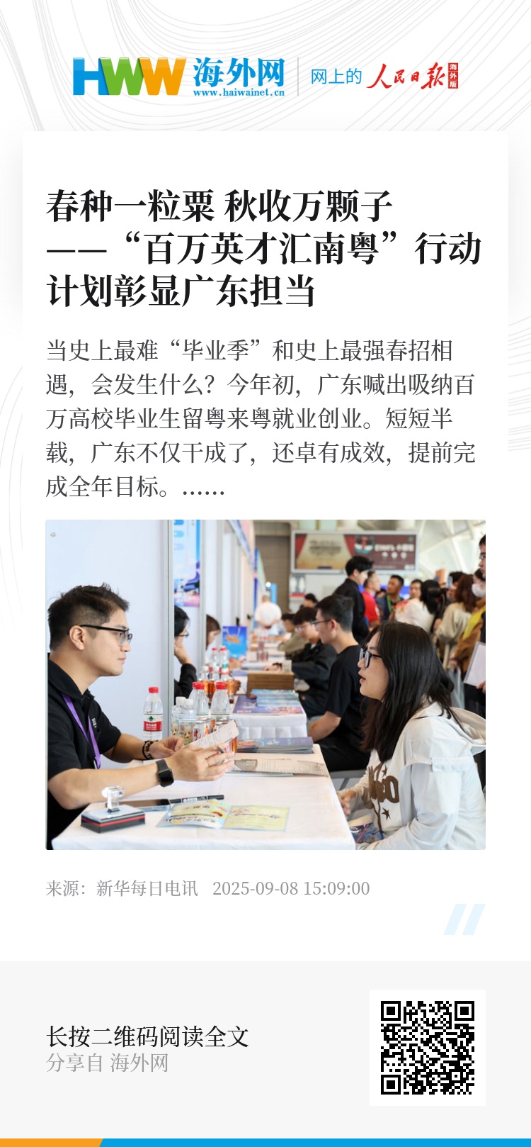 据了解,今年9月中下旬至年底,广东将乘势加力,开展多元就业活动,持续吸引高校毕业生。“百万英才汇南粤”2025年秋季招聘将以全方位升级形态推进——