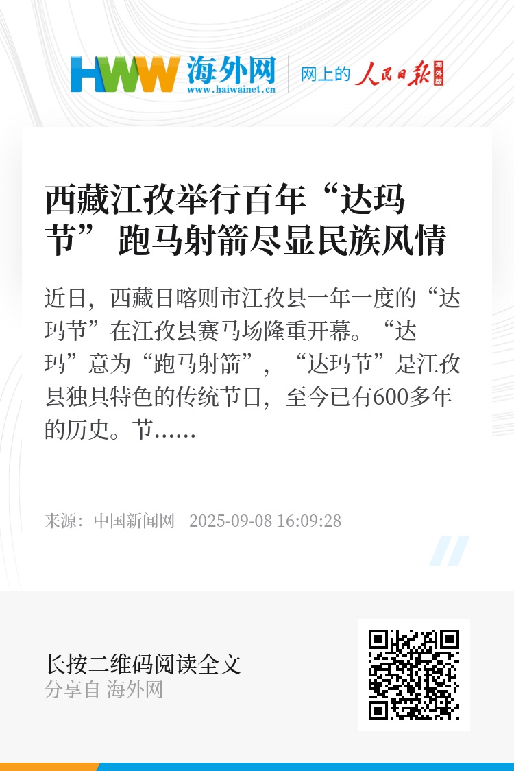 近日,西藏日喀则市江孜县一年一度的“达玛节”在江孜县赛马场隆重开幕。“达玛”意为“跑马射箭”,“达玛节”是江孜县独具特色的传统节日,至今已有600多年的历史。节日期间,赛马、射箭、文艺演出及物资交流等丰富多彩的活动,吸引了众多农牧民与游客积极参与。“达玛节”不仅传承了悠久的藏族文化,也有力推动了当地文旅与经济融合发展。此次活动将持续至9月11日。(白玛玉珍 边巴次仁 制作 王佳琪)