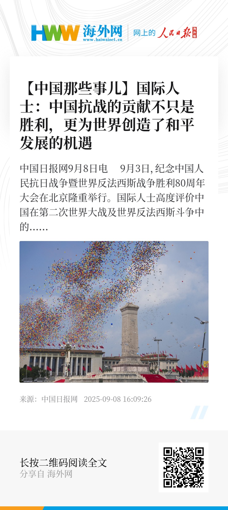 中国日报网9月8日电 9月3日,纪念中国人民抗日战争暨世界反法西斯战争胜利80周年大会在北京隆重举行。国际人士高度评价中国在第二次世界大战及世界反法西斯斗争中的巨大贡献,并强调中国在当前全球事务中仍是维护和平与发展的重要力量。