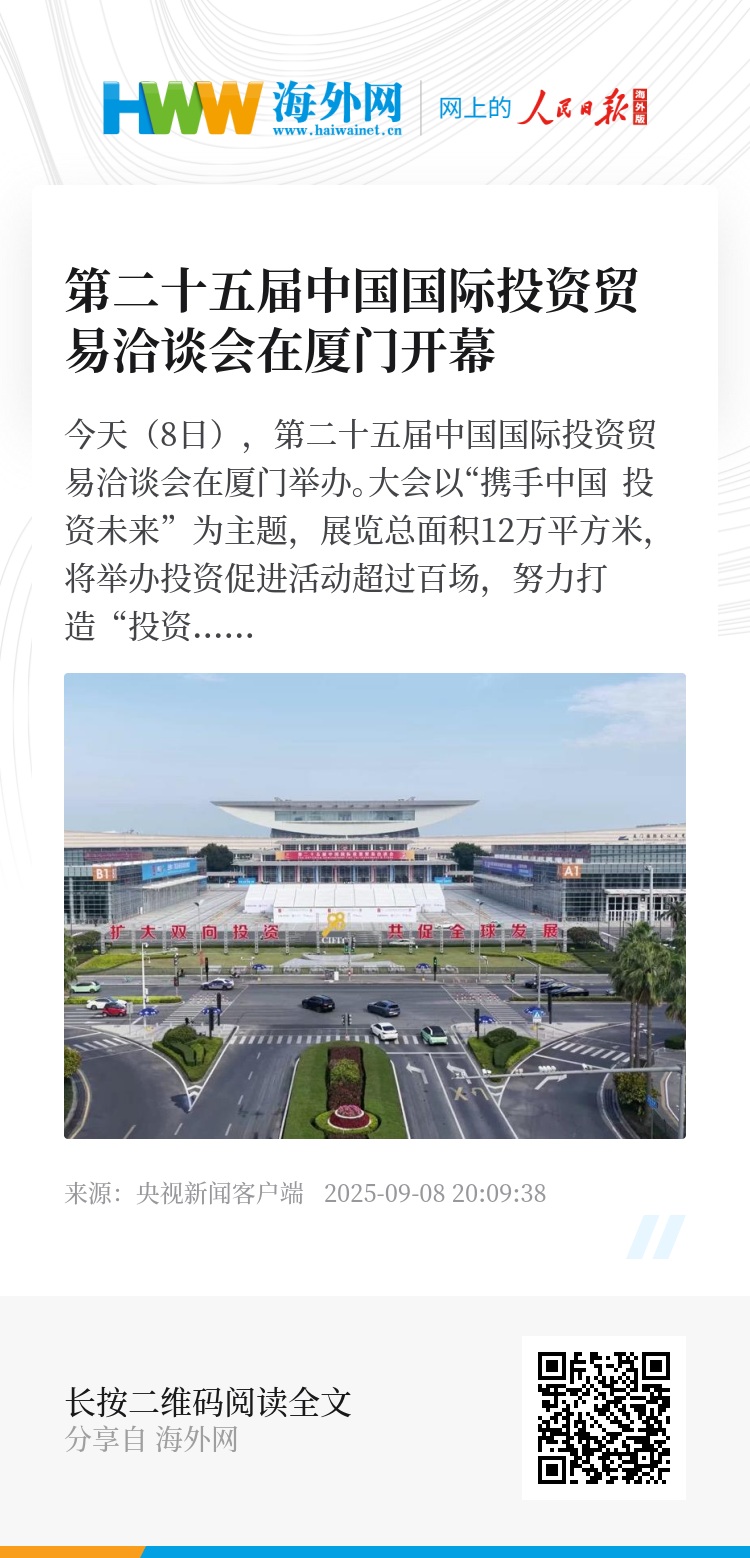 今天(8日),第二十五届中国国际投资贸易洽谈会在厦门举办。大会以“携手中国 投资未来”为主题,展览总面积12万平方米,将举办投资促进活动超过百场,努力打造“投资中国”的标志性展会和双向投资促进的重要服务平台。