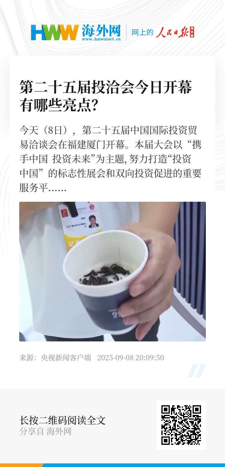 今天(8日),第二十五届中国国际投资贸易洽谈会在福建厦门开幕。本届大会以“携手中国 投资未来”为主题,努力打造“投资中国”的标志性展会和双向投资促进的重要服务平台。本届投洽会有哪些亮点?跟总台记者去现场一探究竟~
