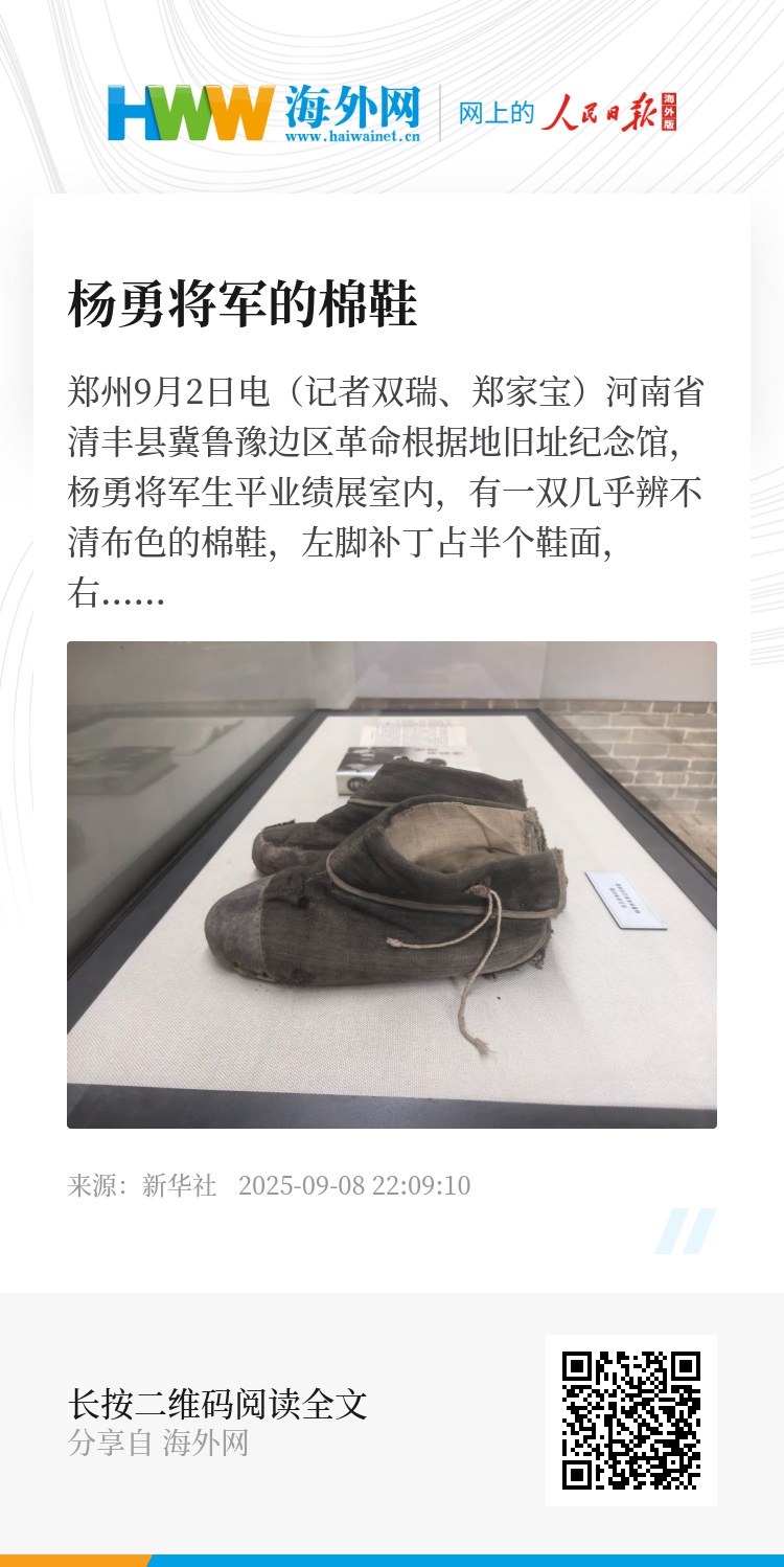 新华社郑州9月2日电(记者双瑞、郑家宝)河南省清丰县冀鲁豫边区革命根据地旧址纪念馆,杨勇将军生平业绩展室内,有一双几乎辨不清布色的棉鞋,左脚补丁占半个鞋面,右脚补丁沿着鞋边围了大半圈。