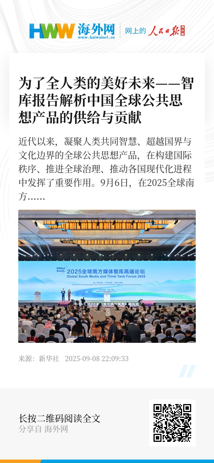 9月6日,在2025全球南方媒体智库高端论坛上,新华社国家高端智库面向全球发布《回应时代呼唤 解答世界之问——中国全球公共思想产品的供给与贡献》中英文智库报告,从“全球公共思想产品的时代需求”“中国全球公共思想产品的体系内涵”“中国全球公共思想产品的理论特质与未来图景”三个方面进行深入剖析与细致解读。