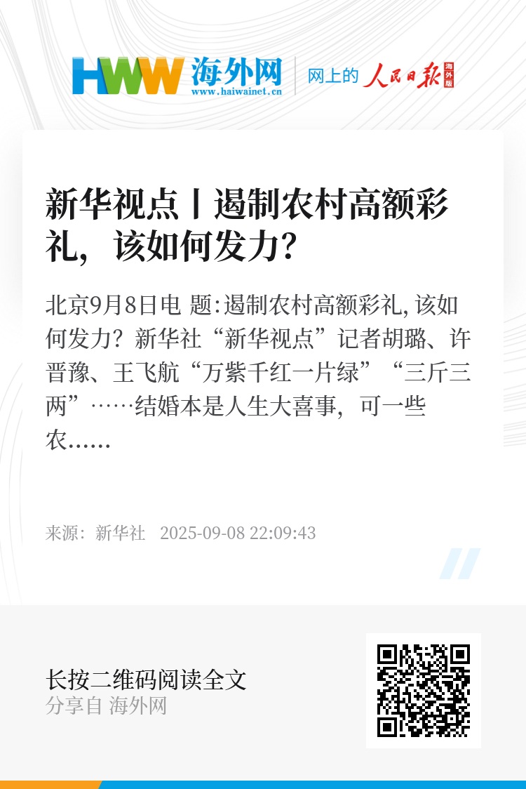 新华社北京9月8日电 题:遏制农村高额彩礼,该如何发力?