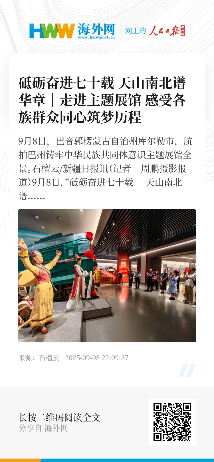 石榴云/新疆日报讯(记者 周鹏摄影报道)9月8日,“砥砺奋进七十载 天山南北谱华章”大型集中采访活动采访团一行,来到位于巴音郭楞蒙古自治州库尔勒市的巴州铸牢中华民族共同体意识主题展馆,沉浸式感受巴州各族群众在党的领导下,同心共建家园、深化文化交融的生动历程。