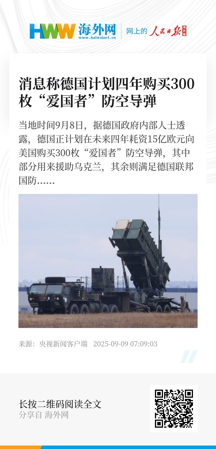 当地时间9月8日,据德国政府内部人士透露,德国正计划在未来四年耗资15亿欧元向美国购买300枚“爱国者”防空导弹,其中部分用来援助乌克兰,其余则满足德国联邦国防军的需要。据悉,挪威将分担2亿欧元的采购费用。