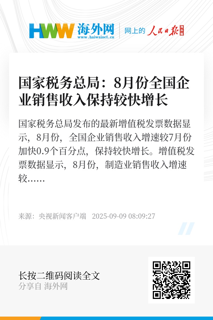 国家税务总局发布的最新增值税发票数据显示,8月份,全国企业销售收入增速较7月份加快0.9个百分点,保持较快增长。