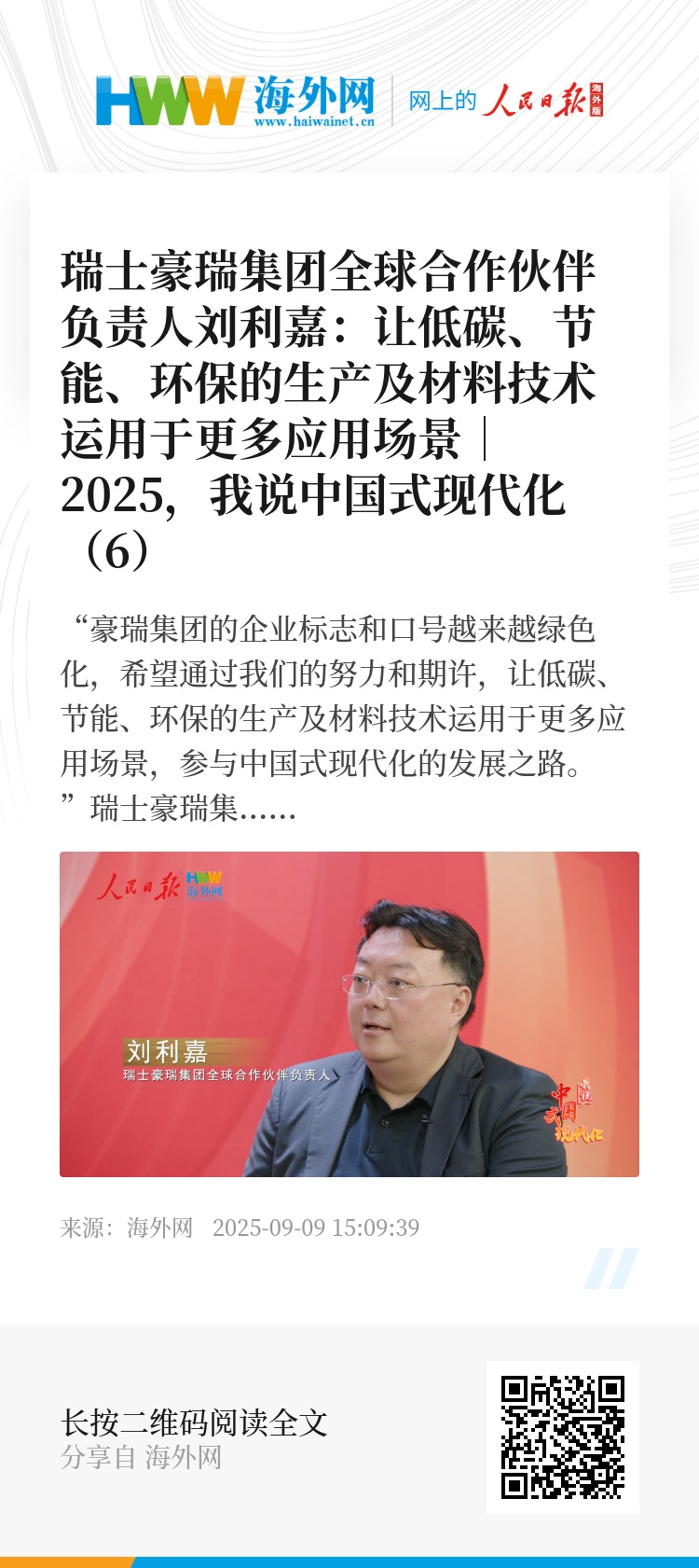 “豪瑞集团的企业标志和口号越来越绿色化,希望通过我们的努力和期许,让低碳、节能、环保的生产及材料技术运用于更多应用场景,参与中国式现代化的发展之路。”瑞士豪瑞集团全球合作伙伴负责人刘利嘉说。