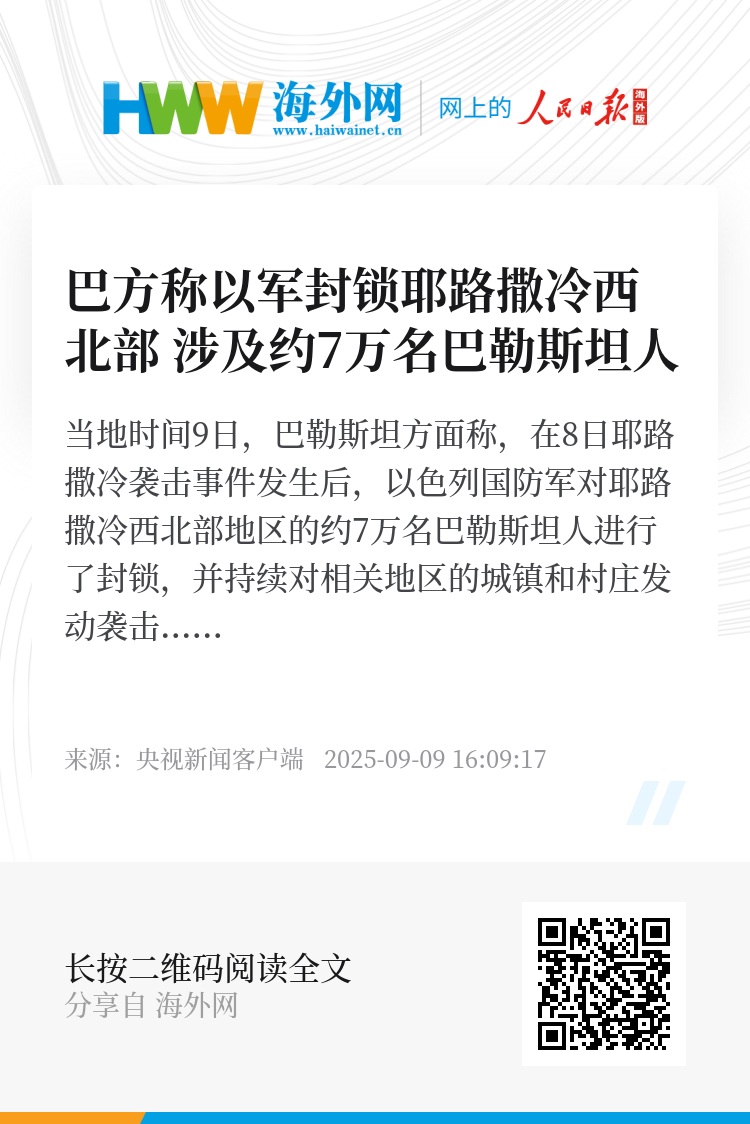 9日,以色列国防部长卡茨表示,他已下令对8日在耶路撒冷实施枪击的两名袭击者的亲属及其村庄的居民实施“民事制裁”,制裁包括拆除“村庄里的任何非法建筑”,并吊销750份进入以色列的工作和入境许可证。(总台记者 周宣)