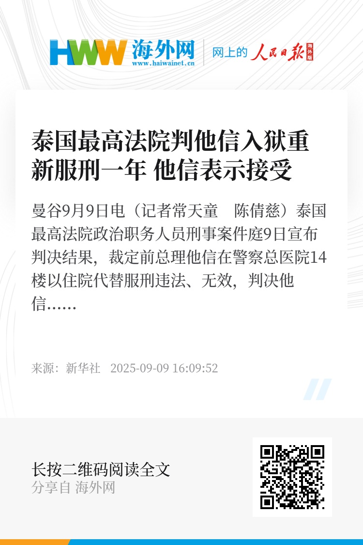 新华社曼谷9月9日电(记者常天童 陈倩慈)泰国最高法院政治职务人员刑事案件庭9日宣布判决结果,裁定前总理他信在警察总医院14楼以住院代替服刑违法、无效,判决他信即日起入狱重新服刑一年。据泰媒报道,他信在当日判决结束后已被送入曼谷特监区服刑。
