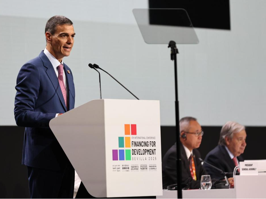 6月30日,在西班牙塞维利亚,西班牙首相桑切斯在联合国第四次发展筹资问题国际会议开幕式上致辞。新华社记者李京摄