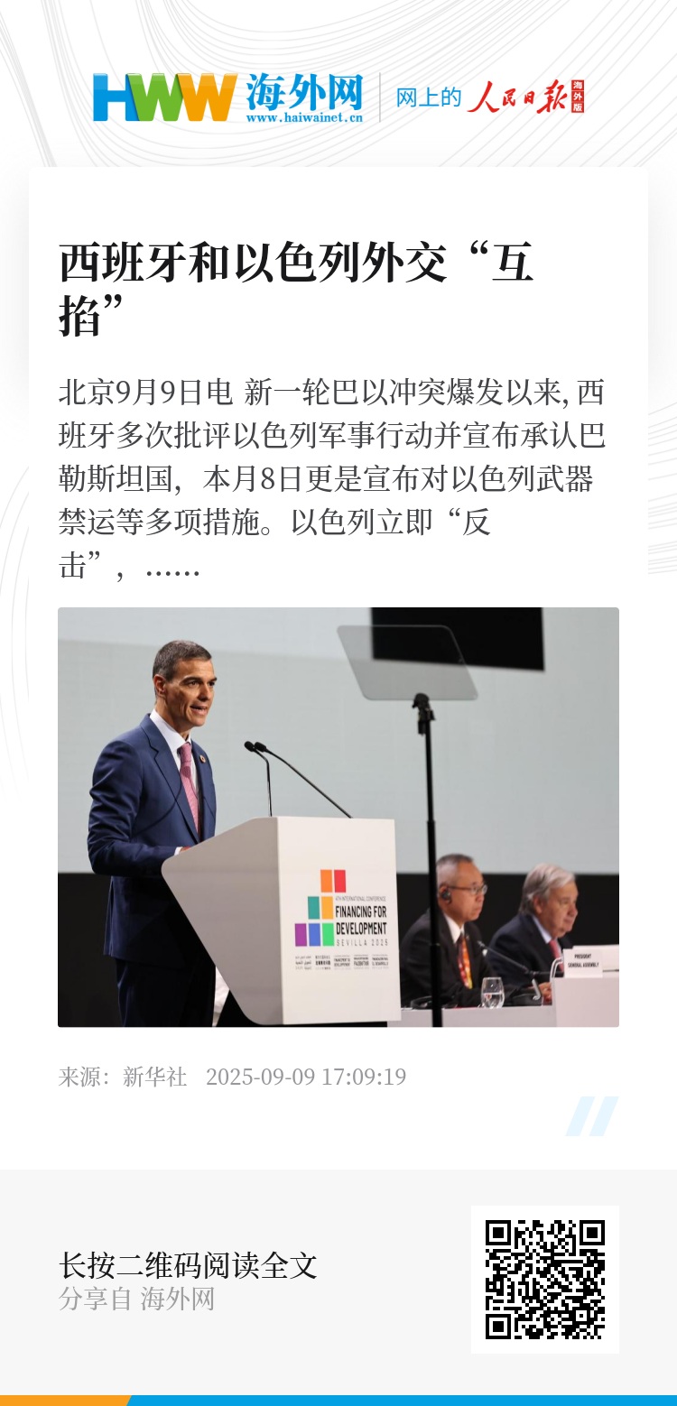 新华社北京9月9日电 新一轮巴以冲突爆发以来,西班牙多次批评以色列军事行动并宣布承认巴勒斯坦国,本月8日更是宣布对以色列武器禁运等多项措施。以色列立即“反击”,当天即禁止西班牙官员入境。随后,西班牙政府召回驻以大使以示抗议。