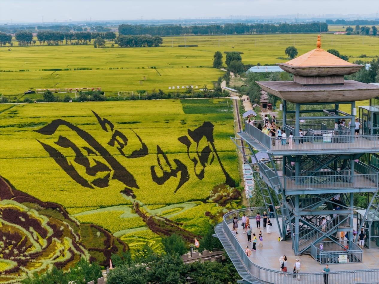 初秋的辽宁沈阳郊外,一片广袤的稻田仿佛被施了魔法,登上高高的观景台远远望去,稻田不再是单一的金黄,而是化作一幅幅恢弘的“大地艺术画”——大大的“囍”字,以巨型牡丹为主体的“国色山河”……众多游客被这些巨幅的画卷吸引驻足拍照,并不时发出“好壮观!”“可真美啊!”的赞叹。