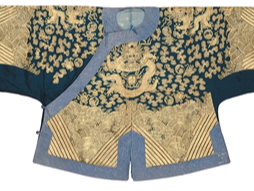 元、明、清时期,中央政府在边疆民族地区任命和分封少数民族头领为地方官员,这类官职统称为土司。宣慰使是土司中级别最高、权力最大的地方官员。石青色金丝织锦龙褂为乾隆赐给车里宣慰使的官服,车里辖境大致相当于今云南省西双版纳傣族自治州。这件龙褂身长70厘米,臂展155厘米,下摆宽74厘米,袖口宽32厘米,大襟右衽,圆领,平阔袖,四开裾,在石青色缎地面料上用金线绣制龙、云、八宝、蝙蝠、海水江崖等图案,针脚平齐均匀,金光闪闪,雍容华贵。领口、袖口、前后襟边缘饰以宽5厘米的灰蓝色金丝织锦。龙褂上共有4团五爪金龙,分布在前后襟和左右肩。龙首正面,头部左右对称,双目圆睁,正视前方,蜿蜒而坐,故又称正龙或坐龙,是龙纹中最尊贵的纹饰,反映了清朝中央政府对民族地区的高度重视。