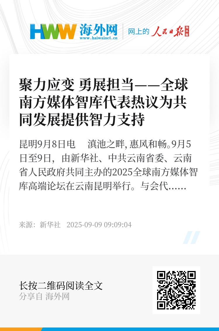 新华社昆明9月8日电 滇池之畔,惠风和畅。9月5日至9日,由新华社、中共云南省委、云南省人民政府共同主办的2025全球南方媒体智库高端论坛在云南昆明举行。