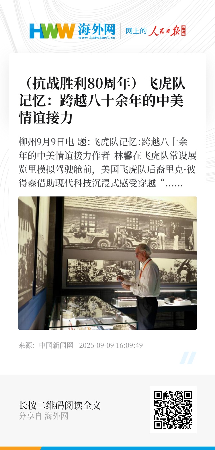 飞虎队常设展览9月7日在广西柳州市开展。7日至8日,包括里克·彼得森在内的多名飞虎队后裔走进广西柳州市飞虎队旧址、飞虎队友谊学校等地,追忆往昔,延续友谊。