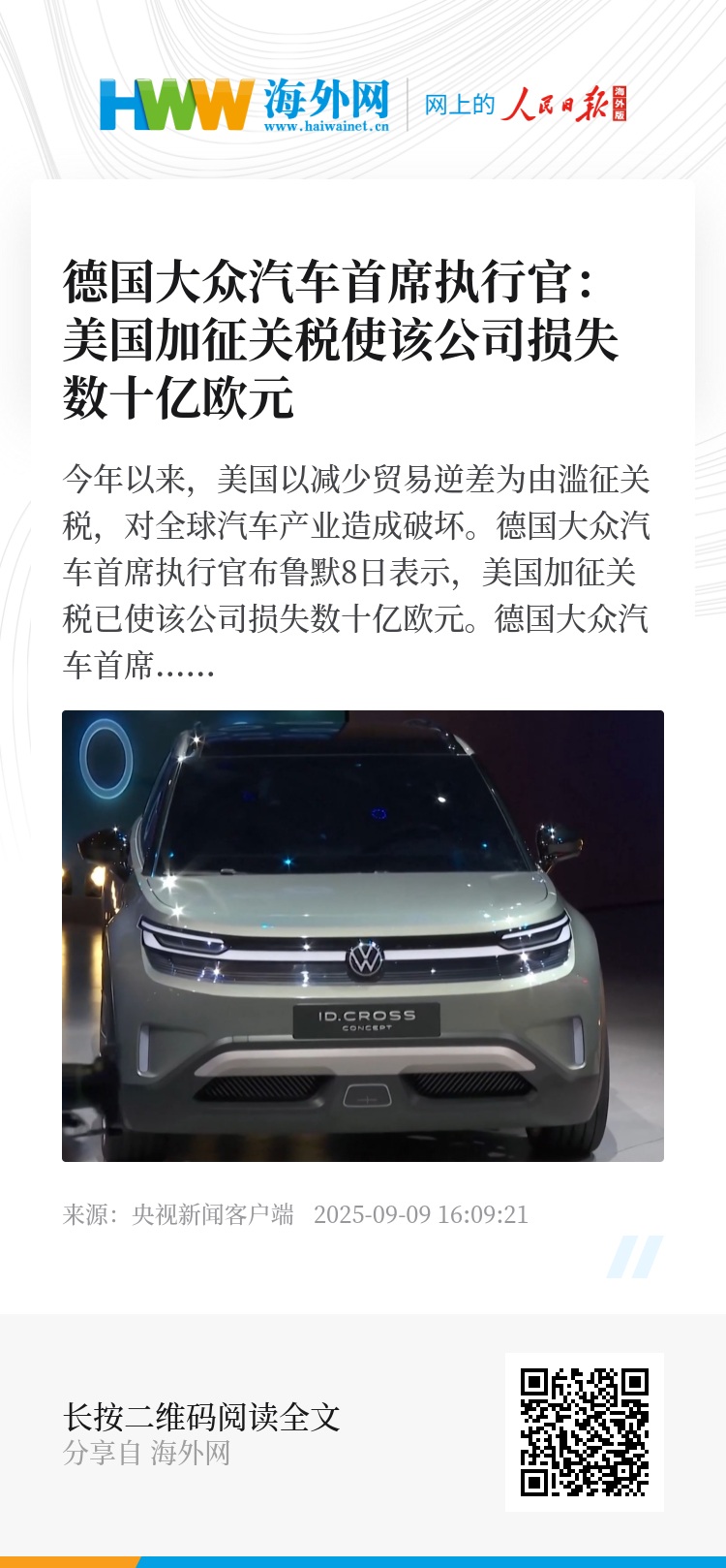 德国大众汽车首席执行官布鲁默8日表示,美国加征关税已使该公司损失数十亿欧元。