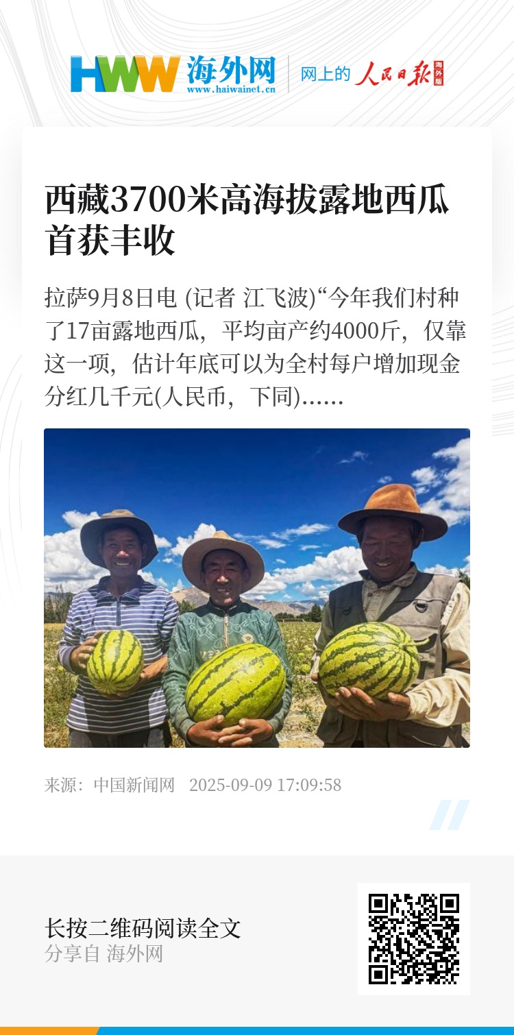 中新网拉萨9月8日电 (记者 江飞波)“今年我们村种了17亩露地西瓜,平均亩产约4000斤,仅靠这一项,估计年底可以为全村每户增加现金分红几千元(人民币,下同)。”9月8日,西藏日喀则桑珠孜区年木乡罗林村党支部书记才旺群培介绍,村里的高海拔露地西瓜规模化种植首次迎来丰收。