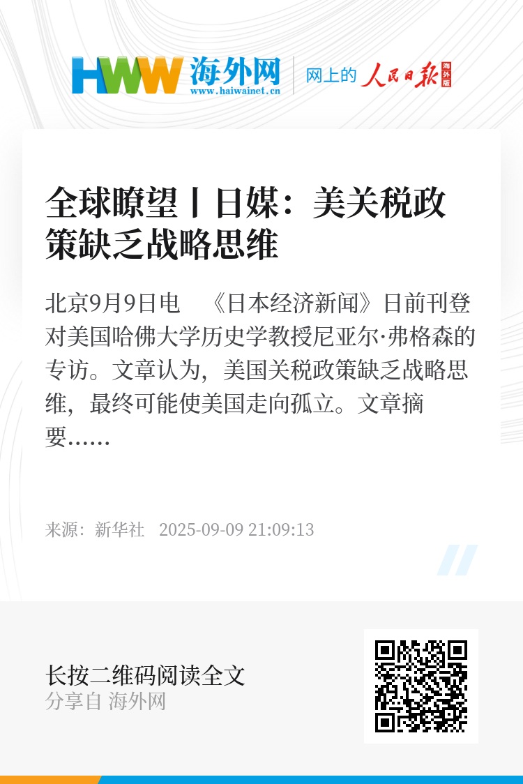 新华社北京9月9日电 《日本经济新闻》日前刊登对美国哈佛大学历史学教授尼亚尔·弗格森的专访。文章认为,美国关税政策缺乏战略思维,最终可能使美国走向孤立。文章摘要如下: