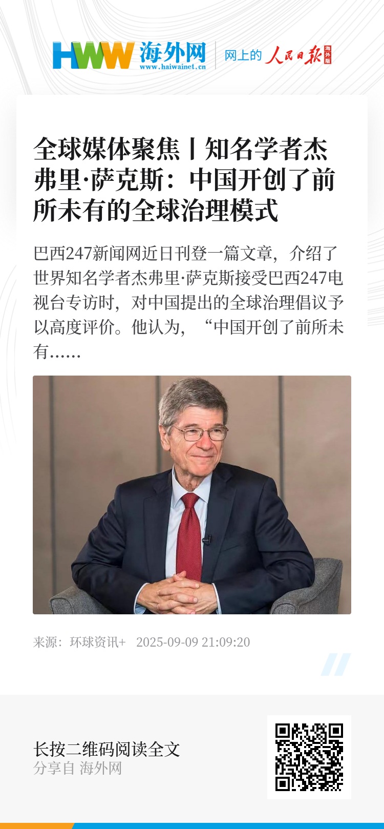 巴西247新闻网近日刊登一篇文章,介绍了世界知名学者杰弗里·萨克斯接受巴西247电视台专访时,对中国提出的全球治理倡议予以高度评价。他认为,“中国开创了前所未有的全球治理模式”。