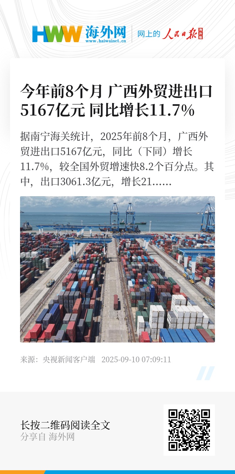 据南宁海关统计,2025年前8个月,广西外贸进出口5167亿元,同比(下同)增长11.7%,较全国外贸增速快8.2个百分点。其中,出口3061.3亿元,增长21.3%;进口2105.7亿元,增长0.1%。