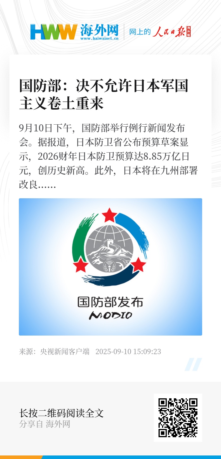 9月10日下午,国防部举行例行新闻发布会。据报道,日本防卫省公布预算草案显示,2026财年日本防卫预算达8.85万亿日元,创历史新高。此外,日本将在九州部署改良型12式陆基反舰远程导弹,射程覆盖中国沿海地区。国防部新闻发言人蒋斌表示,决不允许日本军国主义卷土重来。