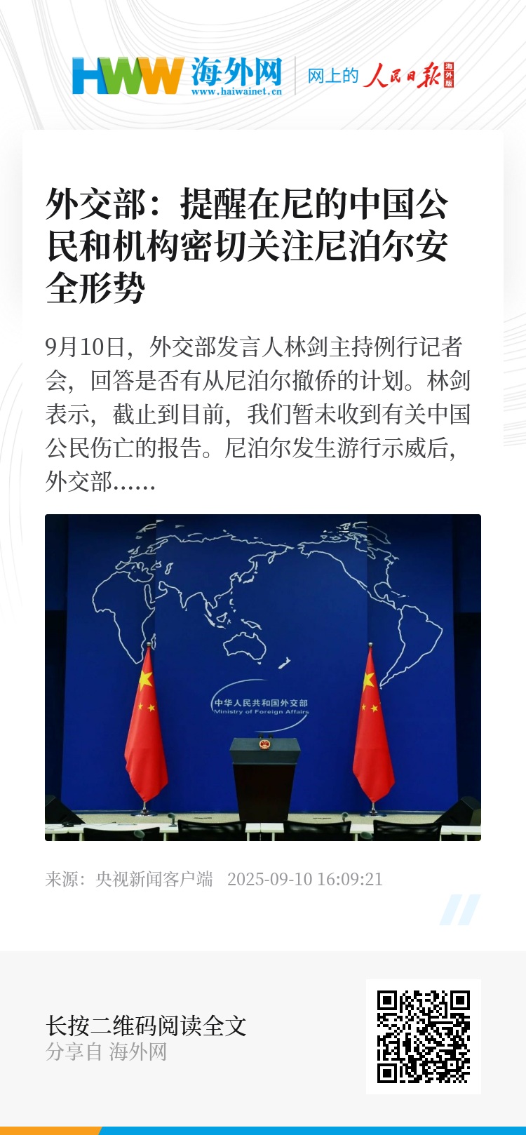 9月10日,外交部发言人林剑主持例行记者会,回答是否有从尼泊尔撤侨的计划。