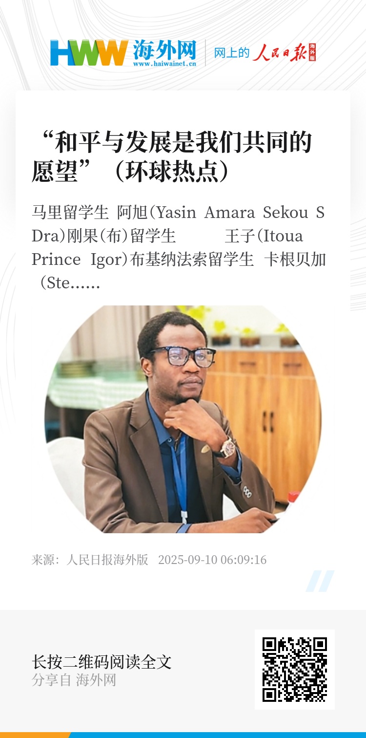 在中国留学,我亲眼见证了这个国家如何将和平理念深深融入发展实践。我的梦想是马里实现像中国一样的和平与繁荣。和马里每个孩子一样,我坚信这个梦想终将实现。