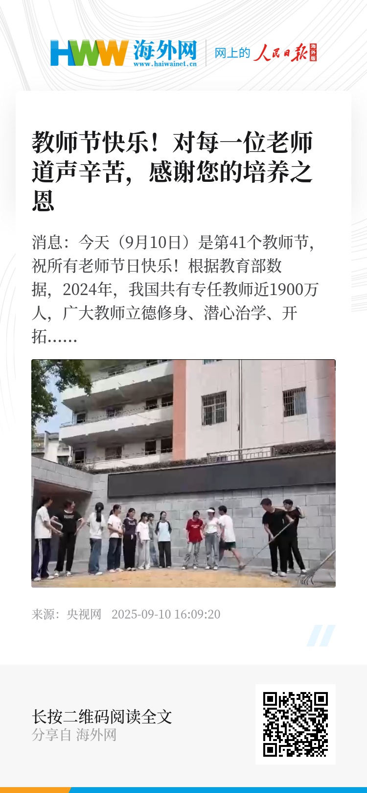 央视网消息:今天(9月10日)是第41个教师节,祝所有老师节日快乐!根据教育部数据,2024年,我国共有专任教师近1900万人,广大教师立德修身、潜心治学、开拓创新,为党育人、为国育才,支撑起世界上最大规模的教育体系。
