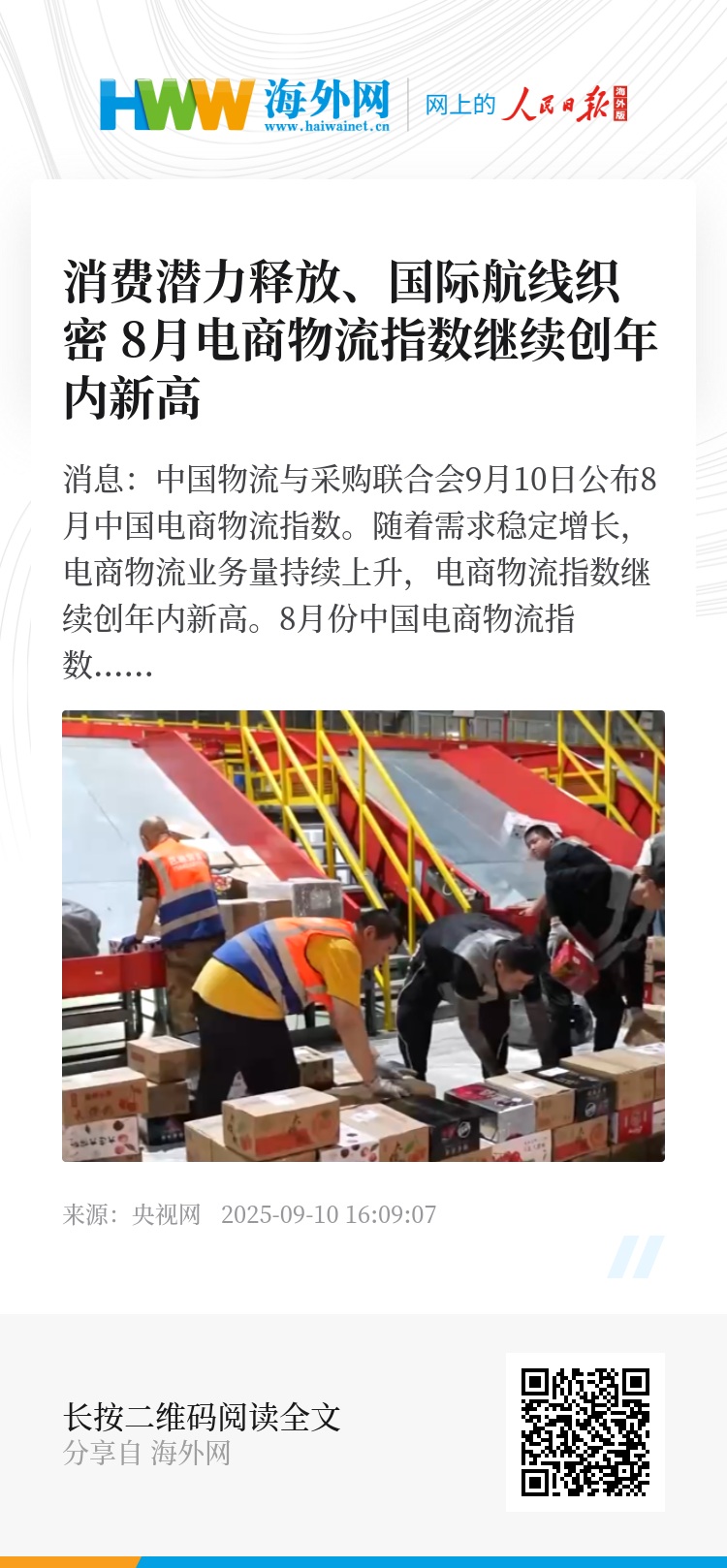 央视网消息:中国物流与采购联合会9月10日公布8月中国电商物流指数。随着需求稳定增长,电商物流业务量持续上升,电商物流指数继续创年内新高。