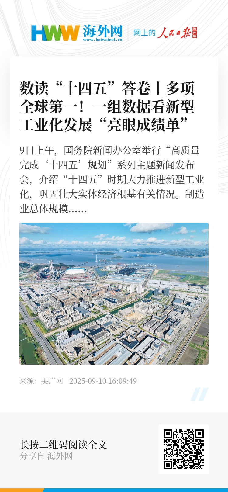 制造业总体规模连续15年保持全球第一,新能源汽车产销量连续10年保持全球第一,专精特新中小企业超14万家……一组数据看新型工业化发展“亮眼成绩单”。