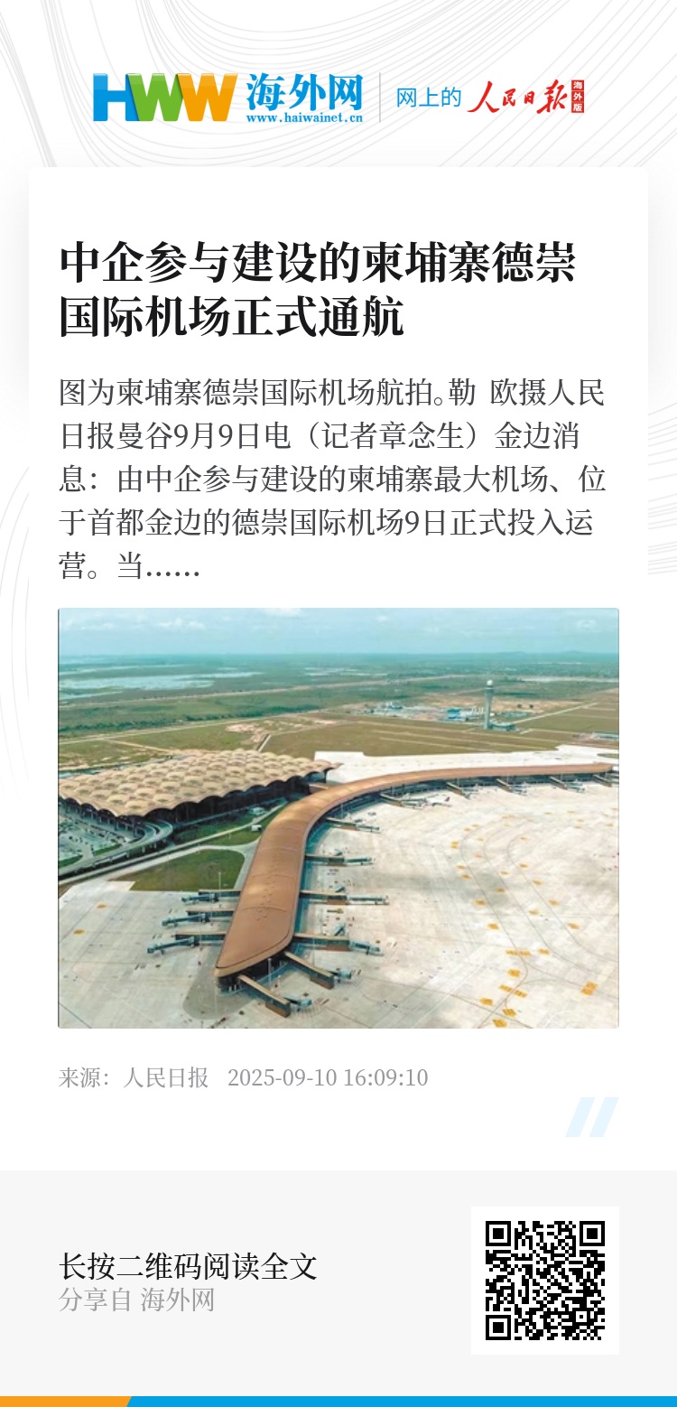 人民日报曼谷9月9日电(记者章念生)金边消息:由中企参与建设的柬埔寨最大机场、位于首都金边的德崇国际机场9日正式投入运营。当天,由柬埔寨航空公司执飞的广州至金边K6611次航班成为首架降落的商业航班,飞机降落后接受了水门礼。