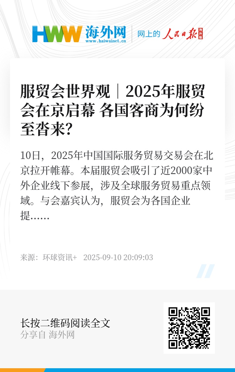 10日,2025年中国国际服务贸易交易会在北京拉开帷幕。本届服贸会吸引了近2000家中外企业线下参展,涉及全球服务贸易重点领域。与会嘉宾认为,服贸会为各国企业提供了宝贵的合作平台,更为全球经济增长注入新动能。