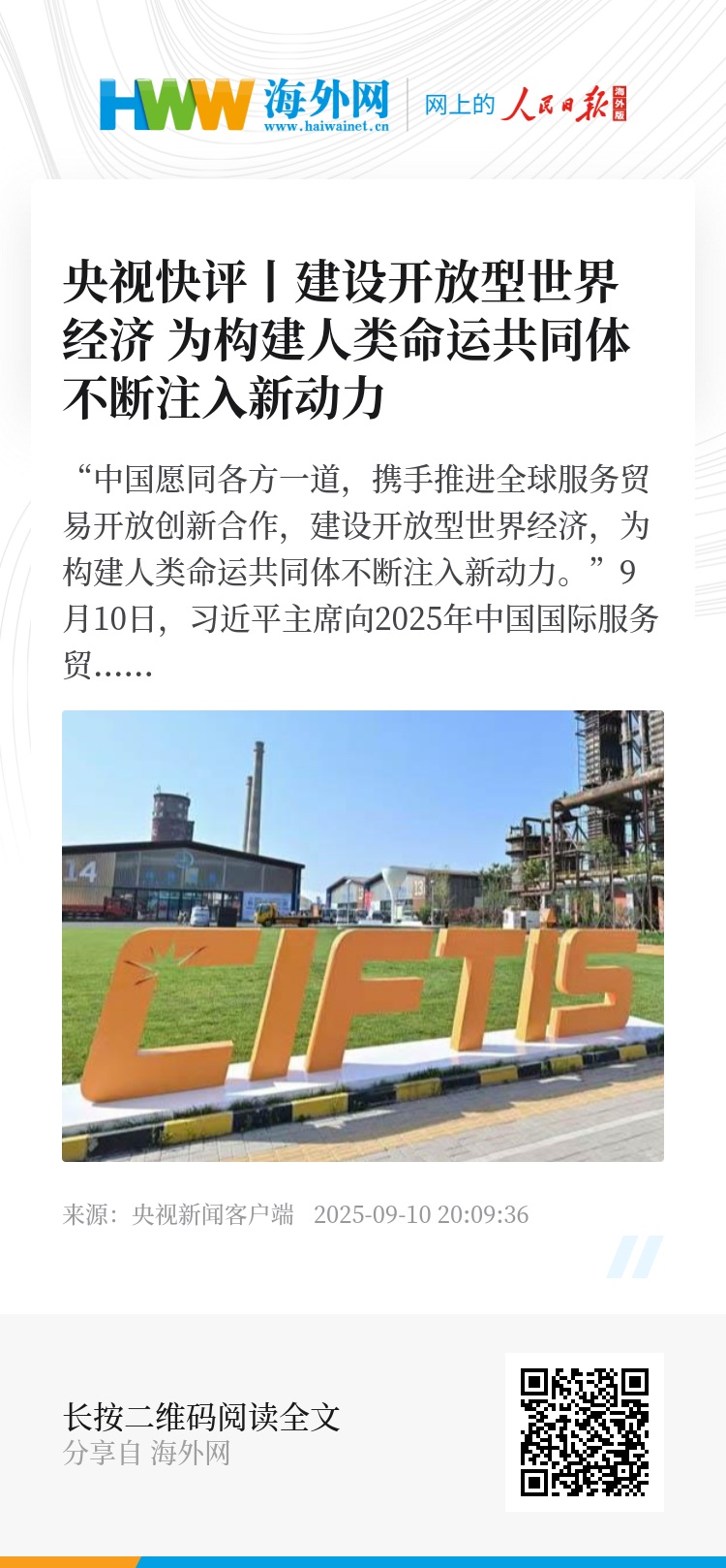 “中国愿同各方一道,携手推进全球服务贸易开放创新合作,建设开放型世界经济,为构建人类命运共同体不断注入新动力。”9月10日,习近平主席向2025年中国国际服务贸易交易会致贺信。习近平主席的贺信,直面全球贸易面临的现实问题,宣布了中国深化服务贸易领域高水平开放、推动服务贸易高质量发展的重要举措,为促进世界经济发展提供了宝贵的正能量和确定性。