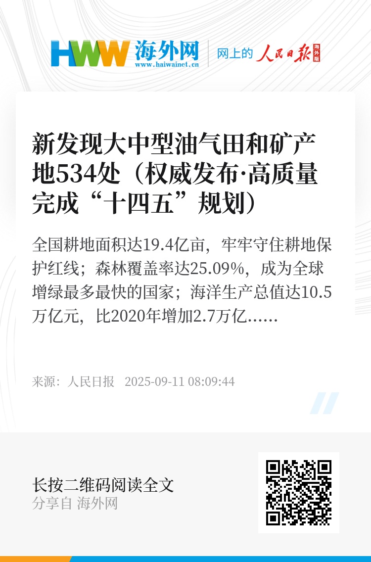 全国耕地面积达19.4亿亩,牢牢守住耕地保护红线;森林覆盖率达25.09%,成为全球增绿最多最快的国家;海洋生产总值达10.5万亿元,比2020年增加2.7万亿元;新发现大中型油气田和矿产地534处……9月10日,国务院新闻办举行“高质量完成‘十四五’规划”系列主题新闻发布会,自然资源部部长、国家自然资源总督察关志鸥等介绍“十四五”时期我国自然资源工作。