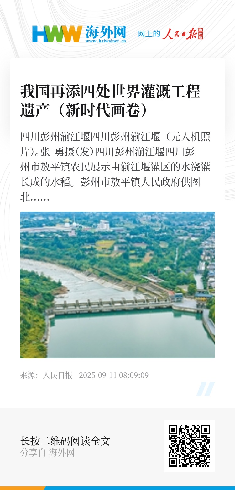 9月10日上午,在马来西亚吉隆坡召开的国际灌排委员会第七十六届国际执行理事会会议上,2025年(第十二批)世界灌溉工程遗产名录正式公布,我国申报的云南元阳哈尼梯田、江苏句容赤山湖灌溉工程、四川彭州湔江堰、北京门头沟永定河古渠灌溉工程全部成功入选。至此,我国世界灌溉工程遗产总数已达42项。