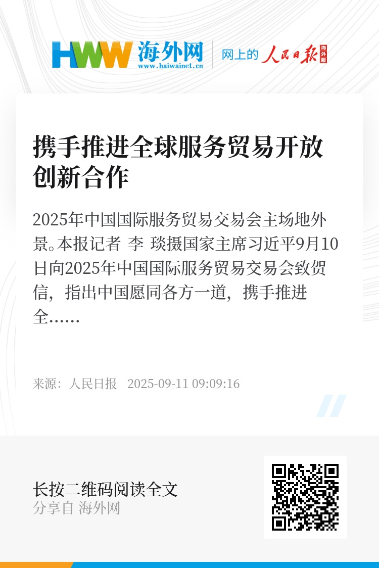 国家主席习近平9月10日向2025年中国国际服务贸易交易会致贺信,指出中国愿同各方一道,携手推进全球服务贸易开放创新合作,建设开放型世界经济,为构建人类命运共同体不断注入新动力。与会嘉宾表示,习近平主席的贺信彰显中国坚定不移扩大高水平对外开放的决心。中国积极推动服务贸易高质量发展,与世界各国分享发展机遇,为世界经济和全球发展注入更多正能量和确定性。