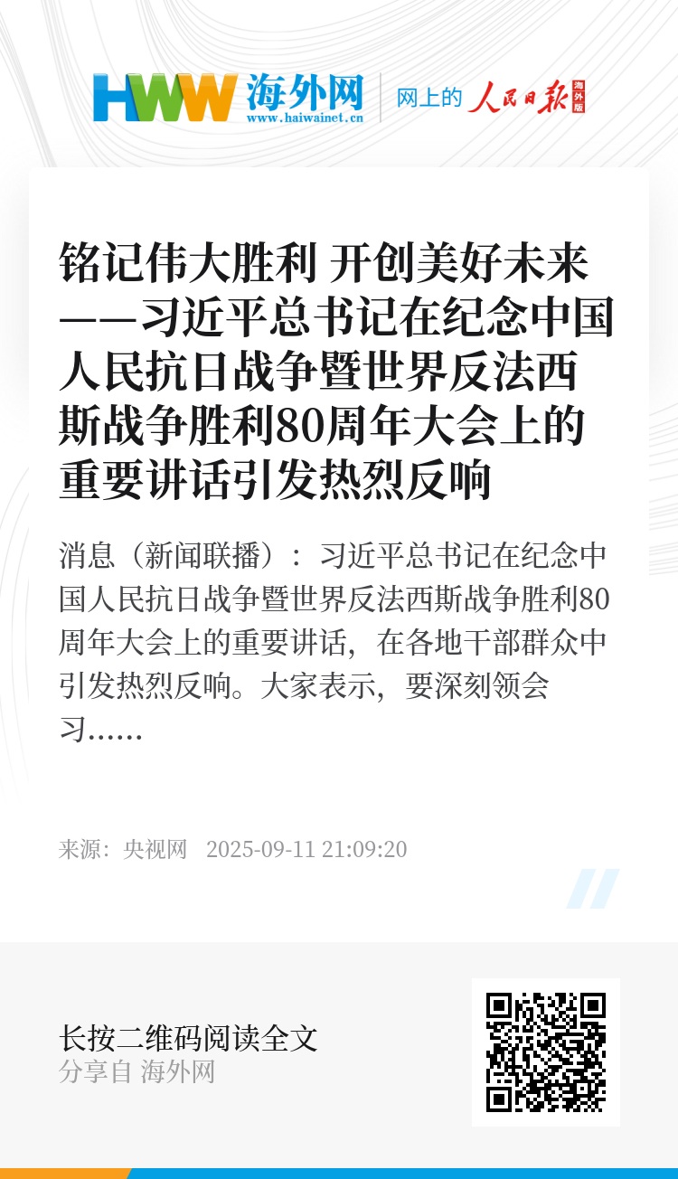国之大典,气势恢宏。习近平总书记深情回顾了中国人民抗日战争的光辉历程,庄严宣示中国人民“铭记历史、缅怀先烈、珍爱和平、开创未来”的坚定立场。总书记的重要讲话传遍大江南北,掷地有声、催人奋进。
