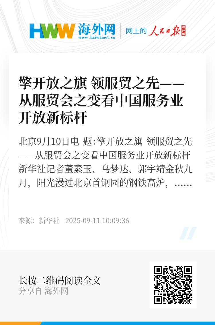新华社北京9月10日电 题:擎开放之旗 领服贸之先——从服贸会之变看中国服务业开放新标杆