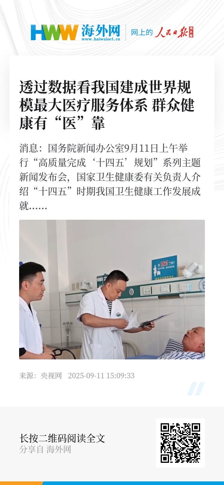国家卫生健康委主任雷海潮称:“推动资源和服务贴近群众。推动优质医疗资源向中西部、东北地区、省域内人口较多城市延伸和基层下沉。截至2025年8月,全国已有338个地市(州、盟)互认医学检查化验项目超过200项。县域医学影像、心电等资源共享中心及中心药房普遍建立。81个城市将完成紧密型城市医疗集团建设试点工作,2199个县(市、区)开展紧密型县域医共体建设。2024年全国双向转诊人次达到3600万,较2020年增长46%,群众上下转诊更方便。”