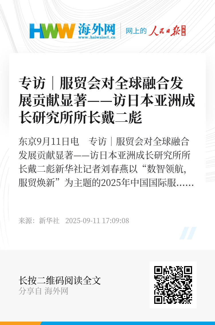 以“数智领航,服贸焕新”为主题的2025年中国国际服务贸易交易会10日在北京开幕。日本亚洲成长研究所所长戴二彪接受新华社记者书面专访时表示,服贸会近年突出展示中国在数字服务、人工智能、金融科技、文化创意等领域的成果,对全球数字经济、绿色发展与服务贸易的融合发展贡献显著。