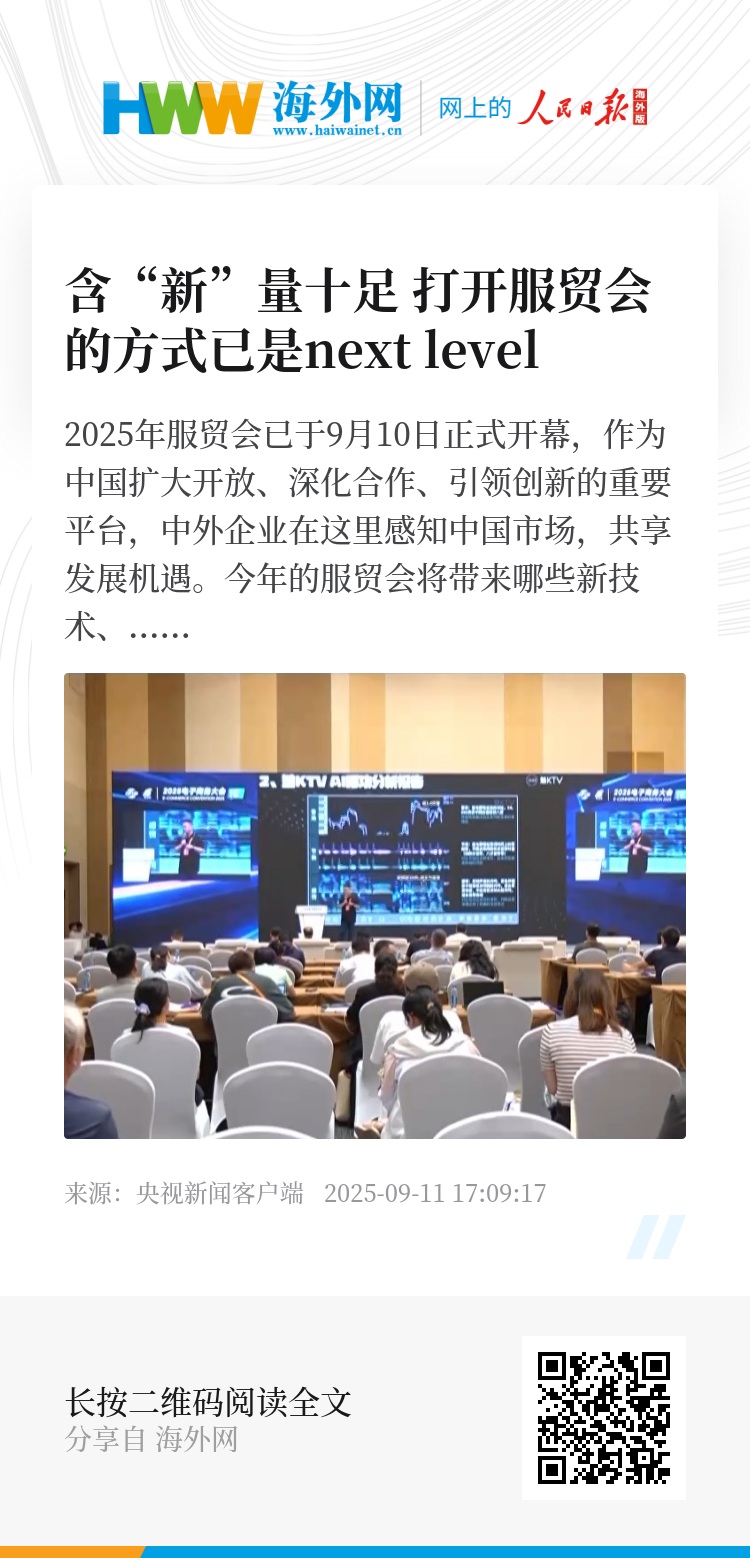 2025年服贸会已于9月10日正式开幕,作为中国扩大开放、深化合作、引领创新的重要平台,中外企业在这里感知中国市场,共享发展机遇。今年的服贸会将带来哪些新技术、新成果?又有哪些新业态和新场景与我们的生活息息相关?今天是服贸会的第二天,有哪些重要日程安排和新品发布?跟随记者去现场看一看。
