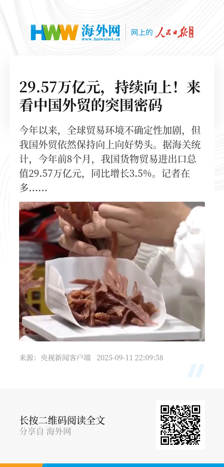 凭借完备的工业体系及强大的供应链优势,中国品牌不断开拓国际市场,今年前8个月,我国出口17.61万亿元,增长6.9%,我国出口连续6个月增长。多元市场拓展与新赛道培育的增长点,正不断为我国外贸注入更持久的新动能。