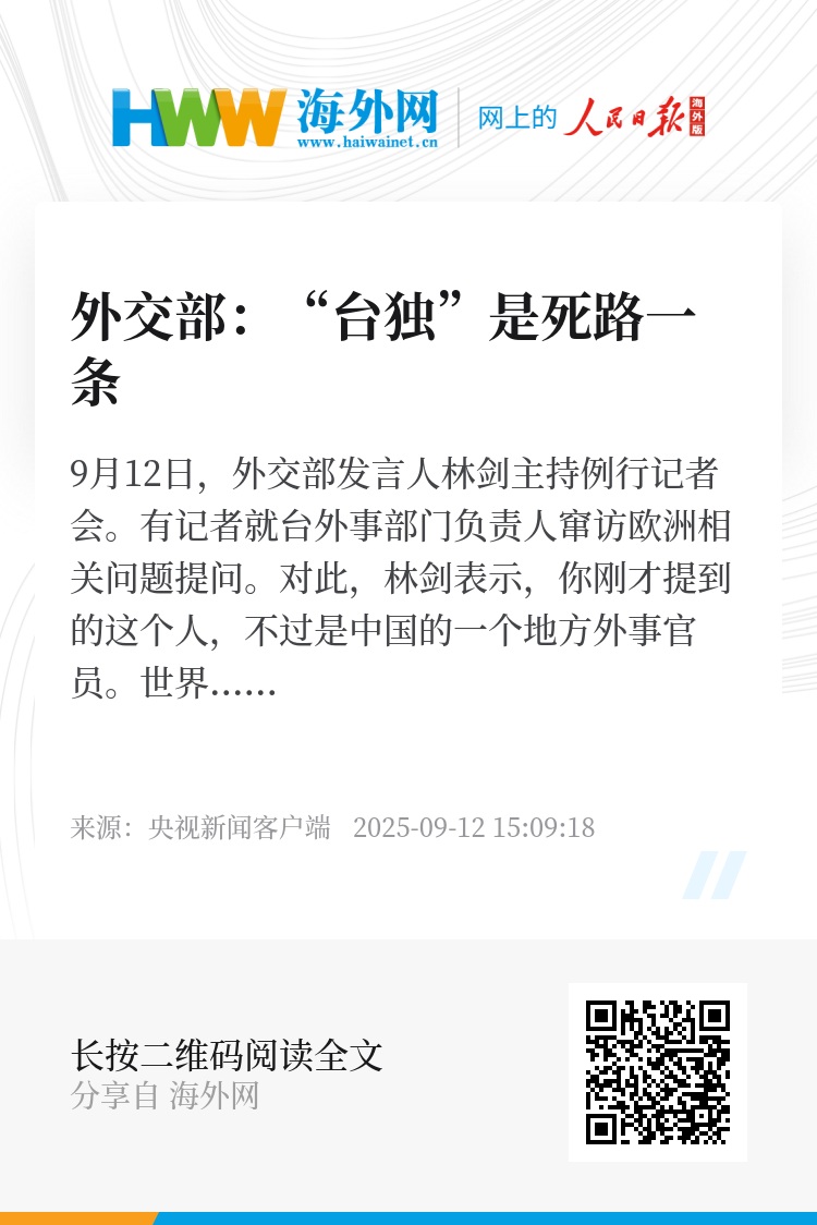 对此,林剑表示,你刚才提到的这个人,不过是中国的一个地方外事官员。世界上只有一个中国,台湾是中国领土不可分割的一部分,台湾问题事关中国主权和领土完整。我们一贯坚决反对建交国同中国台湾地区开展任何形式的官方交往,坚决反对为“台独”分子的活动提供平台,中方对此强烈不满,坚决反对,已向有关国家提出严正交涉。我们敦促欧洲有关国家恪守一个中国原则,立即采取有效措施阻止“台独”分子窜访。