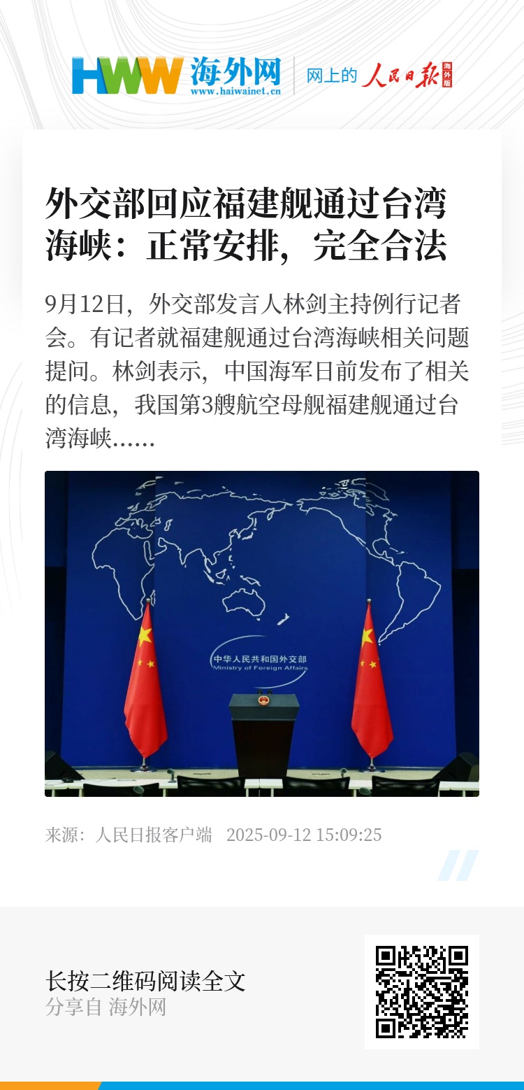 9月12日,外交部发言人林剑主持例行记者会。有记者就福建舰通过台湾海峡相关问题提问。