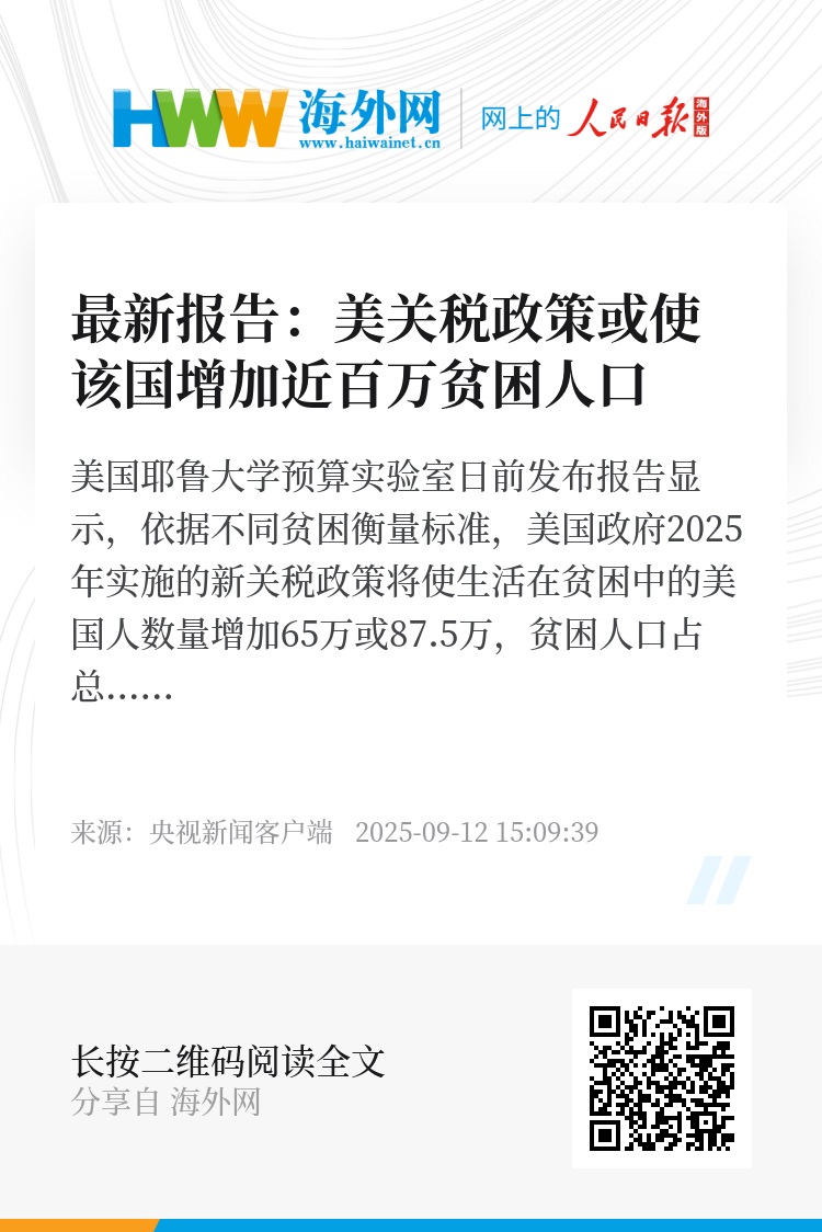 美国耶鲁大学预算实验室日前发布报告显示,依据不同贫困衡量标准,美国政府2025年实施的新关税政策将使生活在贫困中的美国人数量增加65万或87.5万,贫困人口占总人口比例提高0.2%或0.3%。