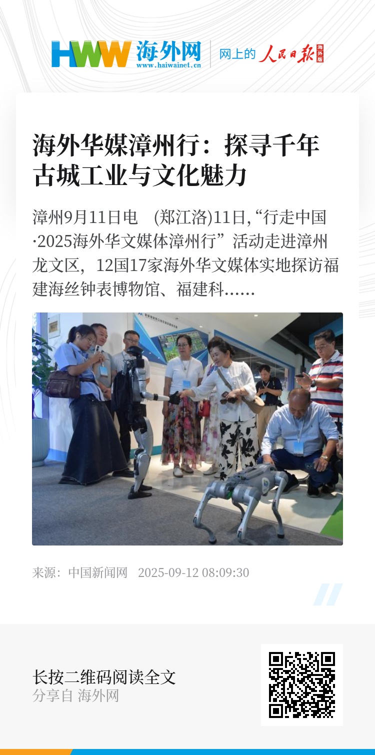 中新网漳州9月11日电 (郑江洛)11日,“行走中国·2025海外华文媒体漳州行”活动走进漳州龙文区,12国17家海外华文媒体实地探访福建海丝钟表博物馆、福建科能集团、片仔癀名医馆等特色点位,感受这座千年古城的工业活力与文化底蕴。