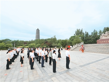 “山河映忠魂”全国英烈讲解员大赛参赛选手在山东渤海革命老区纪念园向人民英雄敬献花篮。(海外网 谢 明摄)