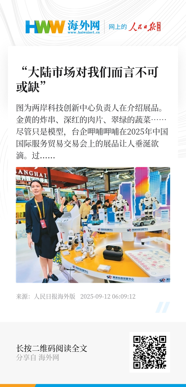 9月10日至14日,2025年中国国际服务贸易交易会在北京首钢园区举办。记者在现场看到,位于首钢国际会展中心的台湾形象展人头攒动,热闹非凡。参展的台商台企表示,希望通过服贸会这个大平台,积极参与两岸产业合作,抢抓大陆发展机遇,在深度融入大陆新发展格局中实现自身更好发展。